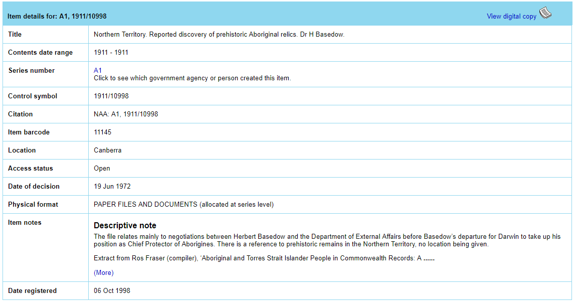 | Figure 1 – detail from NAA record search website, Reported discovery of prehistoric Aboriginal relics, Dr H Basedow |