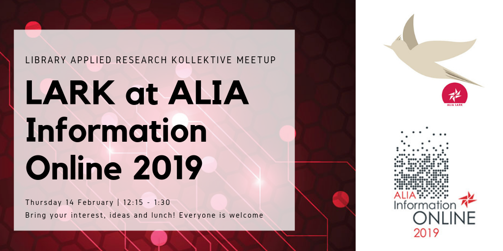 Calling all LARKs attending the ALIA Information Online Conference, come along to the meet-up (Thu 14 Feb, 12:15 – 1:30). Bring your lunch and meet members new and old and get involved while we discuss what 2019 has in store for the Library Applied Research Kollektive (LARK).