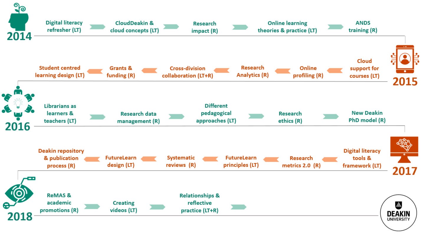 Deakin University Library’s liaison librarian capacity building program began in 2014 as the Training and Development Program. The program is developed and coordinated by the Library’s Research Services team and Learning and Teaching team. Each round is structured to meet the specific professional development needs of Deakin’s liaison librarians and scaffolds their skills and knowledge development. At the beginning of 2018, the program evolved to become the Liaison Librarian Learning and Research Forum.