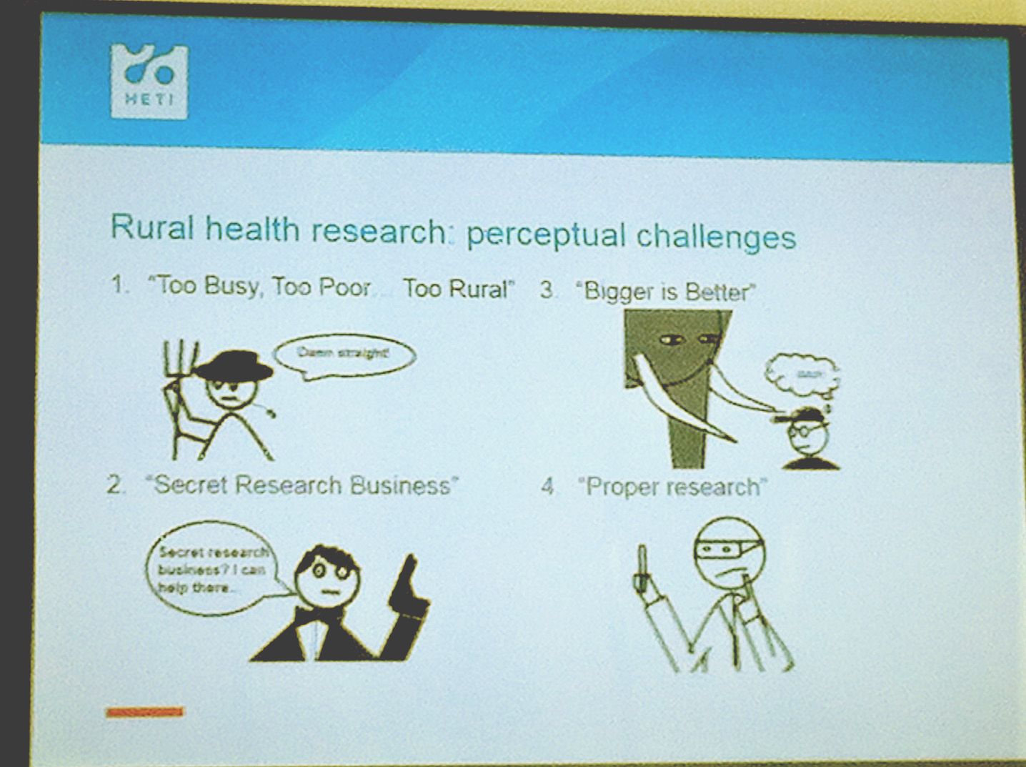 One re-occurring theme of the day was interprofessional learning. We heard from David Schmidt of HETI who talked about overcoming barriers to research and being enablers of research. He also noted that often people put research on a pedestal, thinking it is something that people somewhere far away in lab coats do. David says, ‘If you have tenacity and curiosity, you have what you need to be a good researcher.’ One of my favourite takeaways from David’s talk was the statement that ‘Librarians underestimate their ability to enable research by connecting people’. Here is a slide from David’s presentation, which shows off his amazing MS Paint illustration skills: